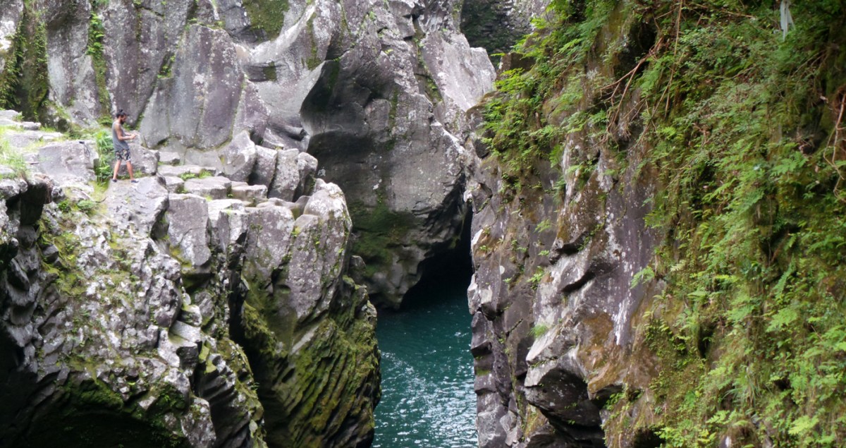 À force d’érosion, la rivière Gokase a fini par percer une tranchée dans les falaises de basalt volcanique formées par une coulée de lave du mont Aso. Cette trachéotomie a laissé des marques bien étranges le long des parois : tantôt vertigineuses, lisses et noires, tantôt régulières, presque symétriques. Les Japonais, qui ont beaucoup d’imagination, y voient les écailles d’un dragon. Et vous ?
