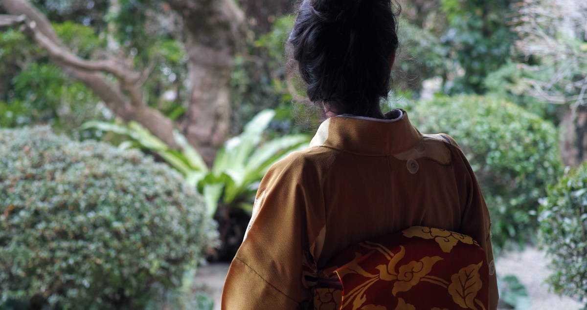 Une bâtisse traditionnelle en bois ouverte sur un paisible jardin japonais. Sur les tatamis, des dizaines de kimonos et obi (ceinture) taillés dans de précieuses étoffes aux couleurs chatoyantes.